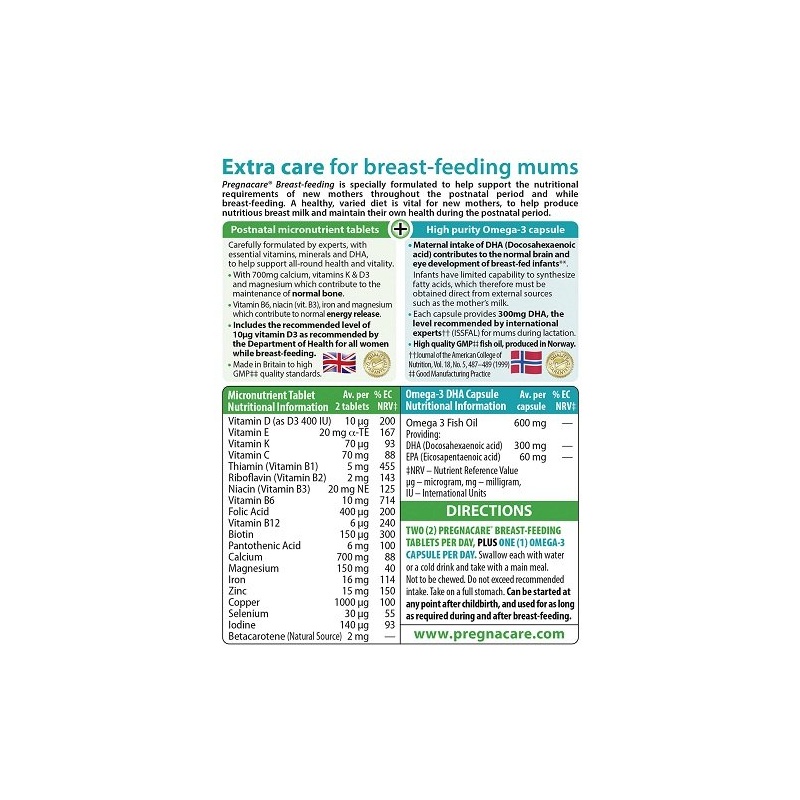Pregnacare® Breast-feeding tabletid. Kaks tabletti sisaldavad: Kaltsium 700mg (88%*), Magneesium 150mg (40%*), Vitamiin C 70mg (88%*), Niatsiin 20mg NE (125%*), Vitamiin E 20mg alfa-TE, Raud 16mg (114%*), Tsink 15mg (150%*), Vitamiin B6 10mg (714%*), Pantoteenhape 6mg (100%*), Vitamiin B1 5mg (455%*), Beetakaroteen 2mg, Vitamiin B2 2mg (143%*), Vask 1000 mkrg (100%*), Foolhape 400mkrg (200%*), Biotiin 150mkrg (300%*), Jood 140mkrg (93%*), Vitamiin K 70mkrg (93%*), Seleen 30mkrg (55%*), Vitamiin D 10mkrg (200%*), vitamiin B12 6 mkrg (240%*).Kõrgkvaliteetsed Omega-3 kapslid.