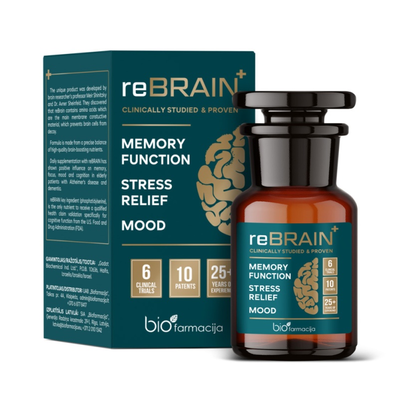 Aja jooksul muutub meie mälu ja mõtlemine vähem erksaks. reBRAIN on looduslik toidulisand, mis aitab säilitada üldist ajutegevust, toetada mälu, keskendumisvõimet, mõtteselgust ja elukvaliteeti. Šveitsis läbiviidud uuring* näitas positiivset mõju Alzheimeri tõvega patsientide mälule, keskendumisvõimele, meeleolule ja kognitsioonile. Kahel reBRAINi koostisosal: fosfatidüülseriinil (PS) ja fosfatiidhappel (PA) on koguni 10 rahvusvahelist patenti ja 6 kliinilist uuringut.